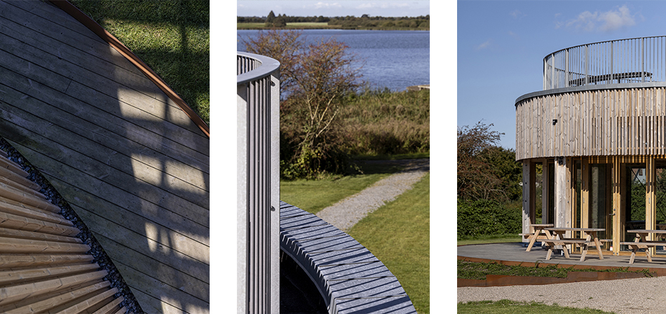 Fra terrassen fører en buet trappe op til tagterrassen, hvor en lav, cirkelformet mur yder læ mod vestenvinden. Herfra er der udsigt over søen, det omkringliggende landskab og det lokale fugleliv – en platform for ro, refleksion og naturoplevelse.