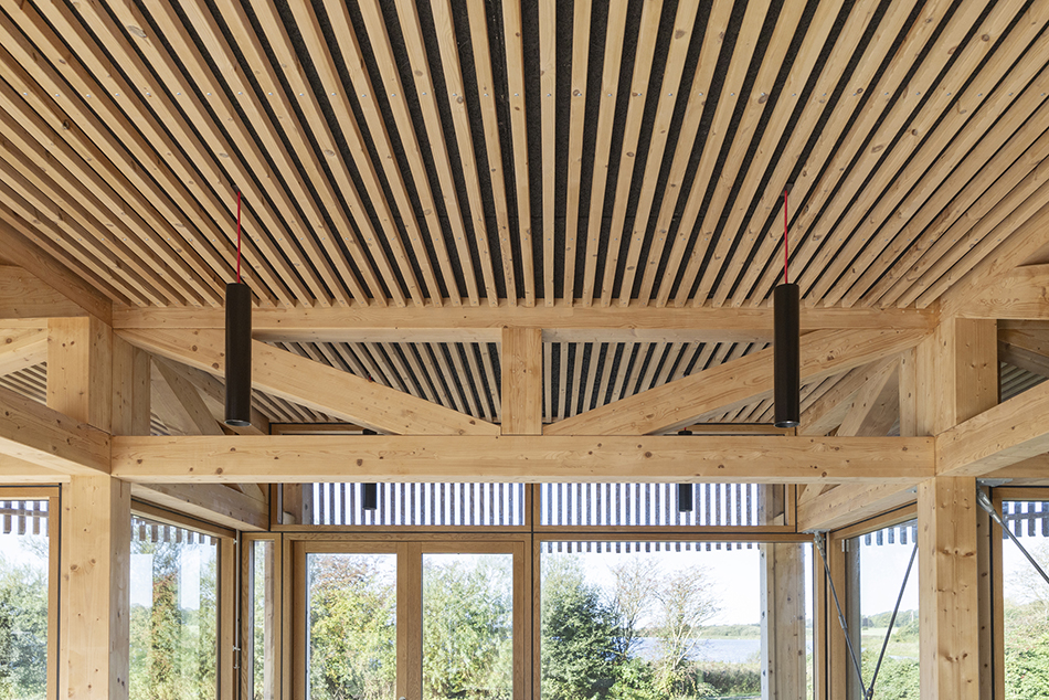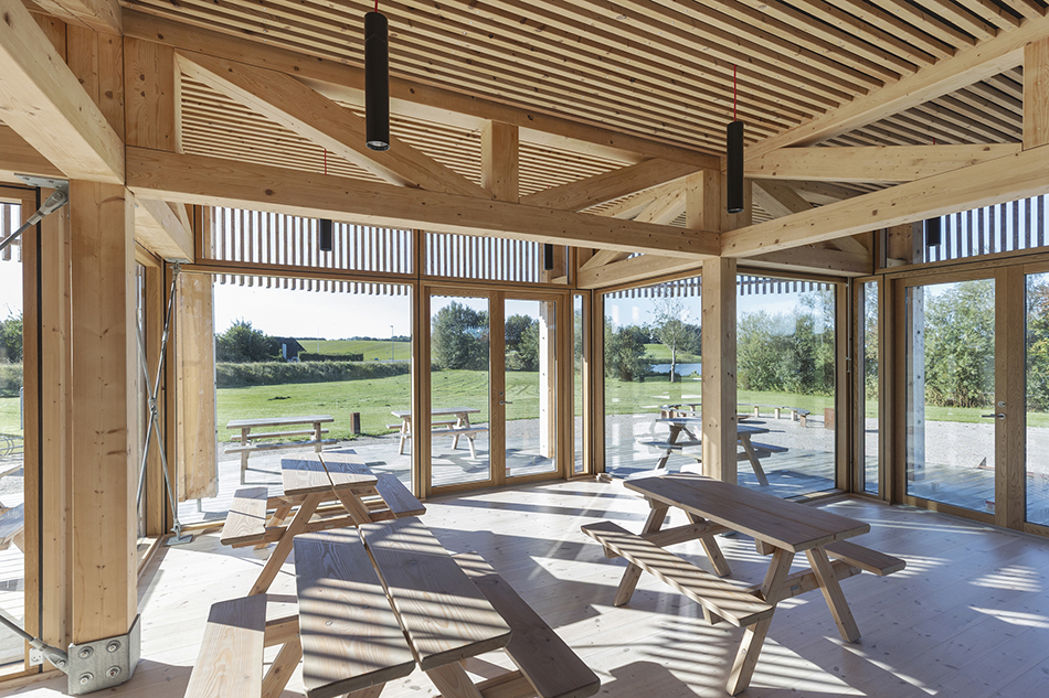 Indvendigt er det centrale fællesrum møbleret med faste træbænke, der spejler pavillonens konstruktion og materialitet. To store dobbeltdøre åbner rummet op mod en overdækket terrasse, som løber langs størstedelen af bygningens facade og udvider opholdszonen mod landskabet.