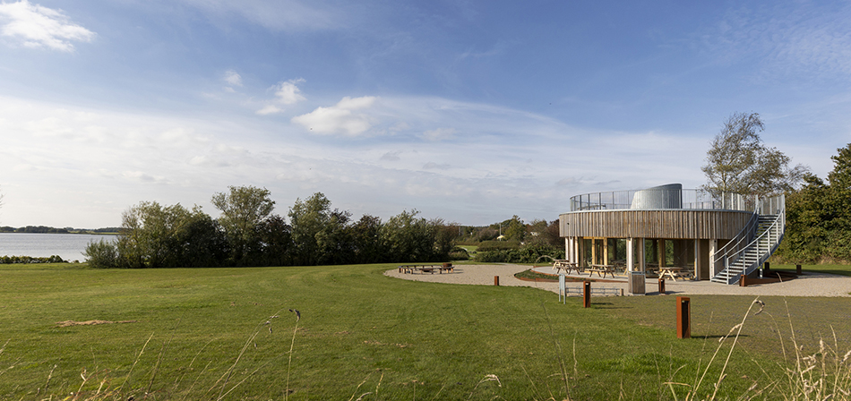 Placering i landskabetØdis Søpavillon er placeret på kanten af Ødis Sø i det sydlige Jylland. Den runde bygning ligger diskret i det åbne landskab, men fremstår markant i mødet med besøgende. Den cirkulære form sikrer, at pavillonen virker åben og inviterende fra alle retninger – en gestus, der understøtter ønsket om tilgængelighed og fællesskab i naturen.