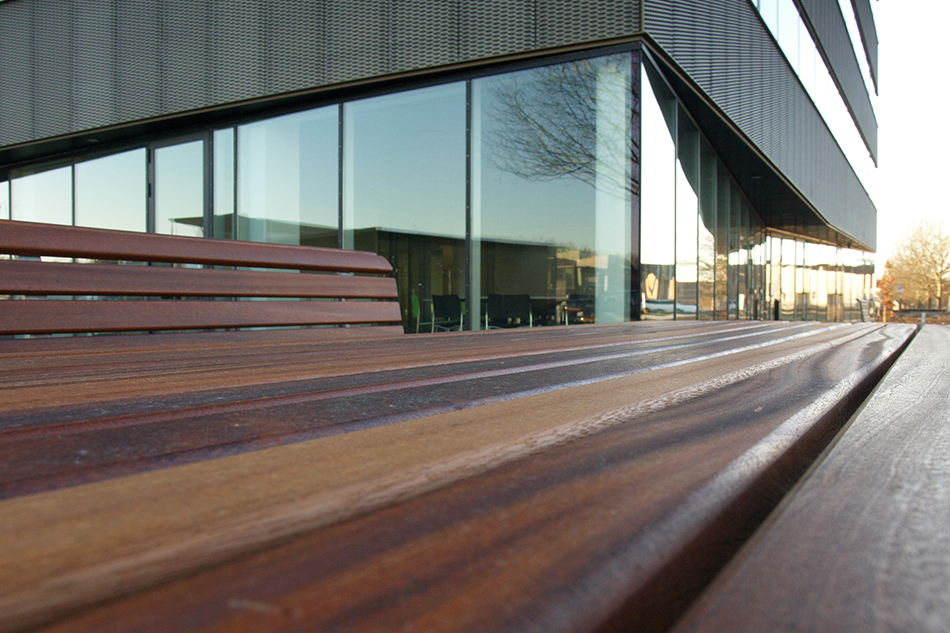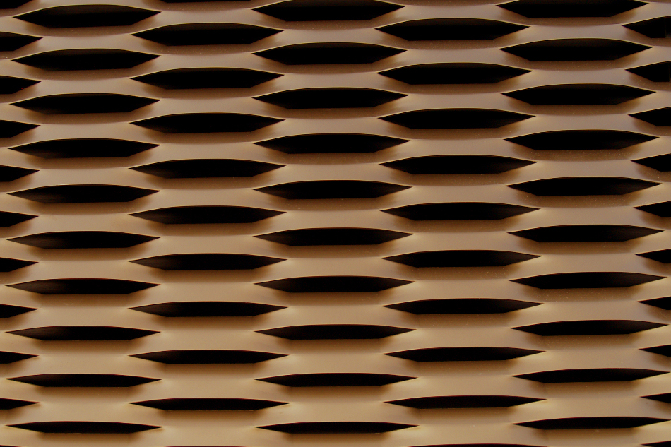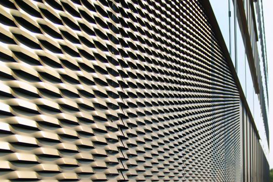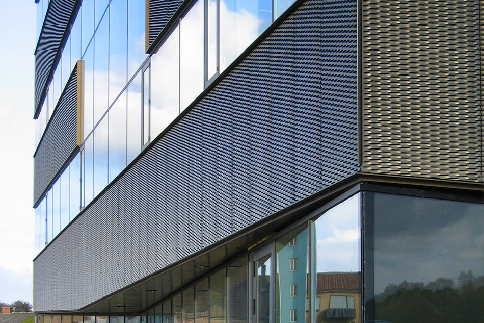 Bygningen er kubisk og med et stort indre atrium, der fungerer som fordelingsrum. Facaderne er beklædt med bronzefarvede anodiserede strækmetalplader i let skrånede bånd, kun delt af vinduesbåndene. Underetagen er udført med skrå facader i sort som kontrast til strækmetallet.