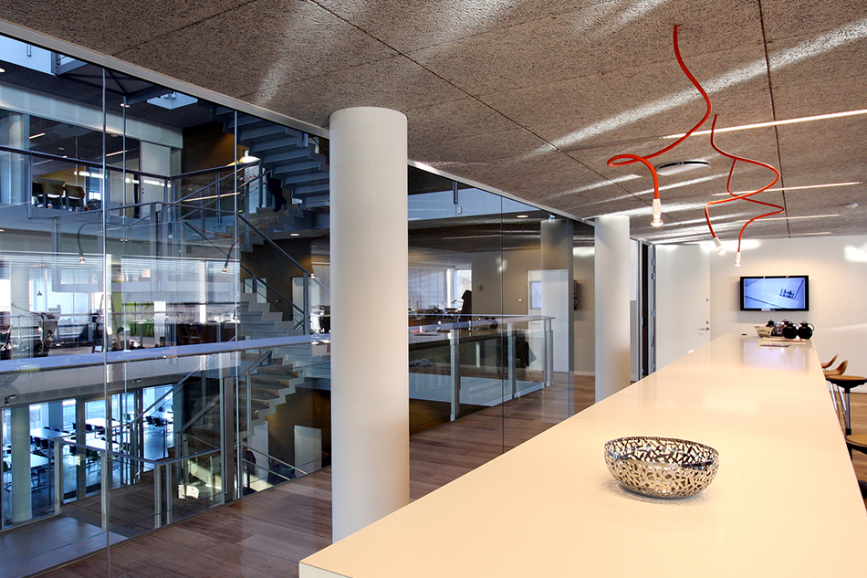 Kontoretagerne er funktions- og arealoptimeret og udført søjle- og vægfrie med stor fleksibilitet for indretningen, der kan indrettes som storrumskontorer, flermandskontorer eller som enkeltmandskontorer.