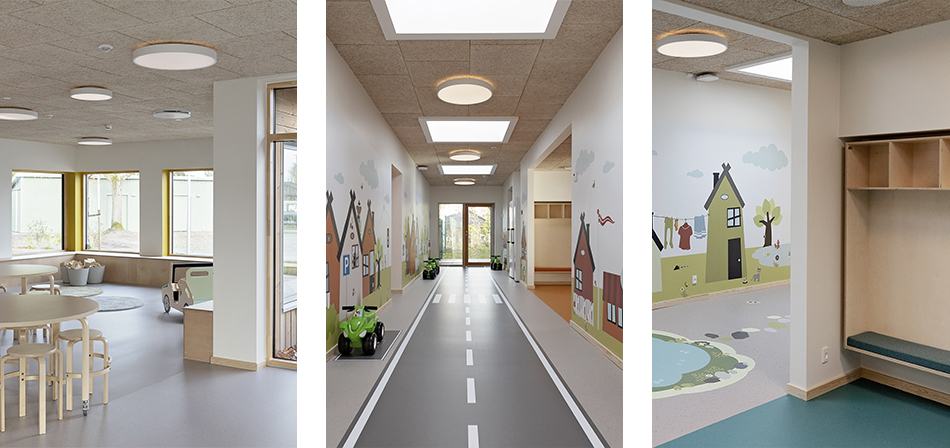 Rum på børns præmisserInstitutionen er opdelt i fire overskuelige klynger: tre med to grupperum hver og en fjerde med administration. Opdelingen skaber nærvær og tryghed i hverdagen.