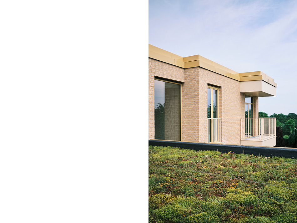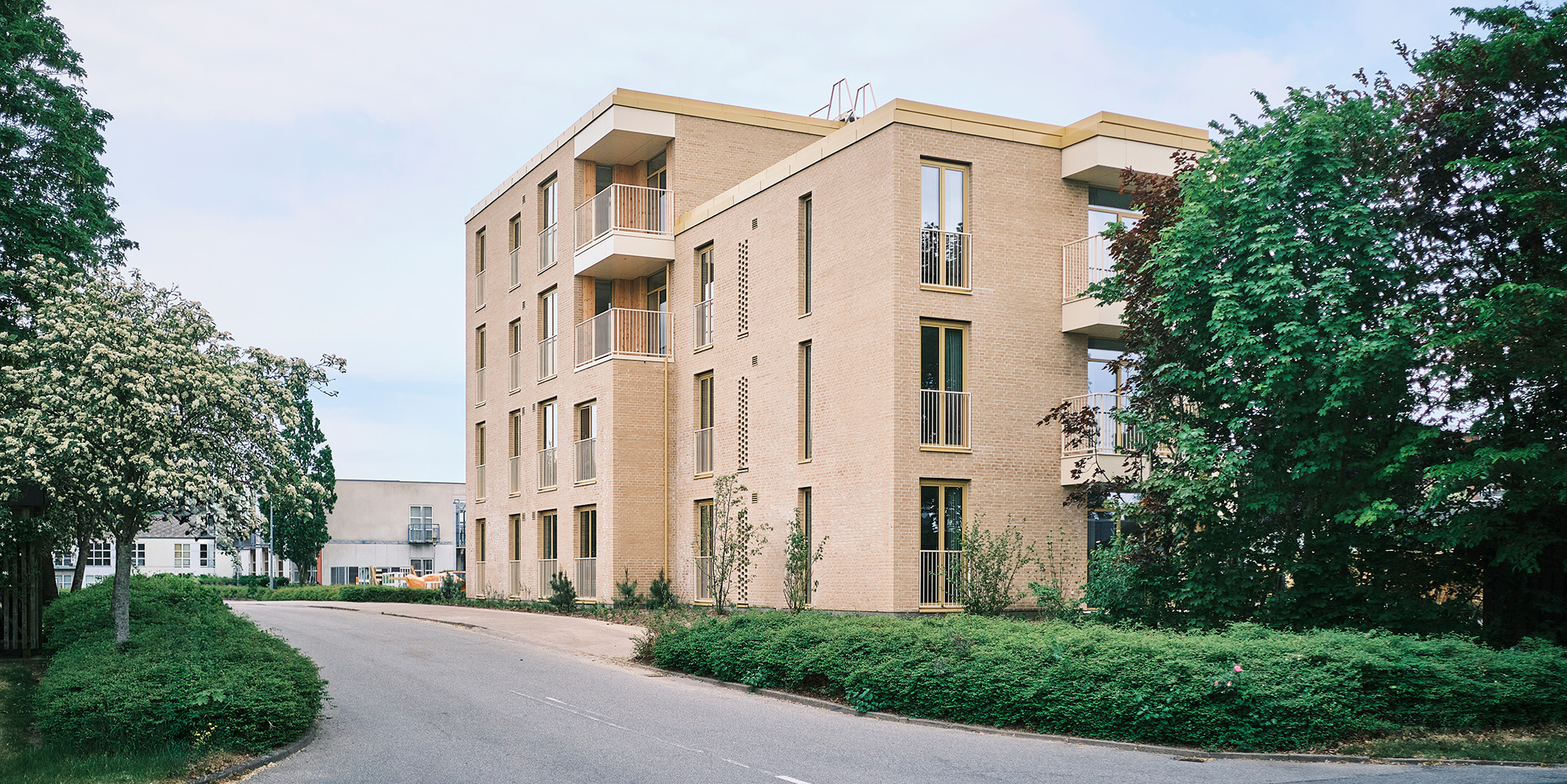 Alle lejligheder har franske altaner fra gulv til loft, der indrammer udsigten. Nogle af lejlighederne har adgang via en udvendig gangbro, der også bruges som altan. De robuste altaner i sandfarvet tegl tilføjer dybde og et visuelt element til facaden.