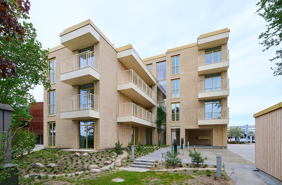 Boligkomplekset i Billund, der blev taget i brug i juni 2024, består af tre adskilte volumener, som tilsammen rummer 12 lejligheder. De tre volumener forbindes af en fælles lobby og trappe, hvor trappens lette, svævende design opnås med minimale støtteelementer.