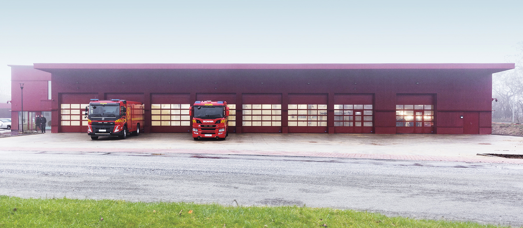 Kolding Kommune har fået en moderne brandstation, hvor funktionalitet og arkitektur går hånd i hånd. Anlægget består af to tydeligt adskilte bygninger – en garagebygning til køretøjer og tekniske funktioner samt en administrationsbygning med faciliteter til arbejde, træning og hvile. Sammen danner de en effektiv ramme for byens beredskab.