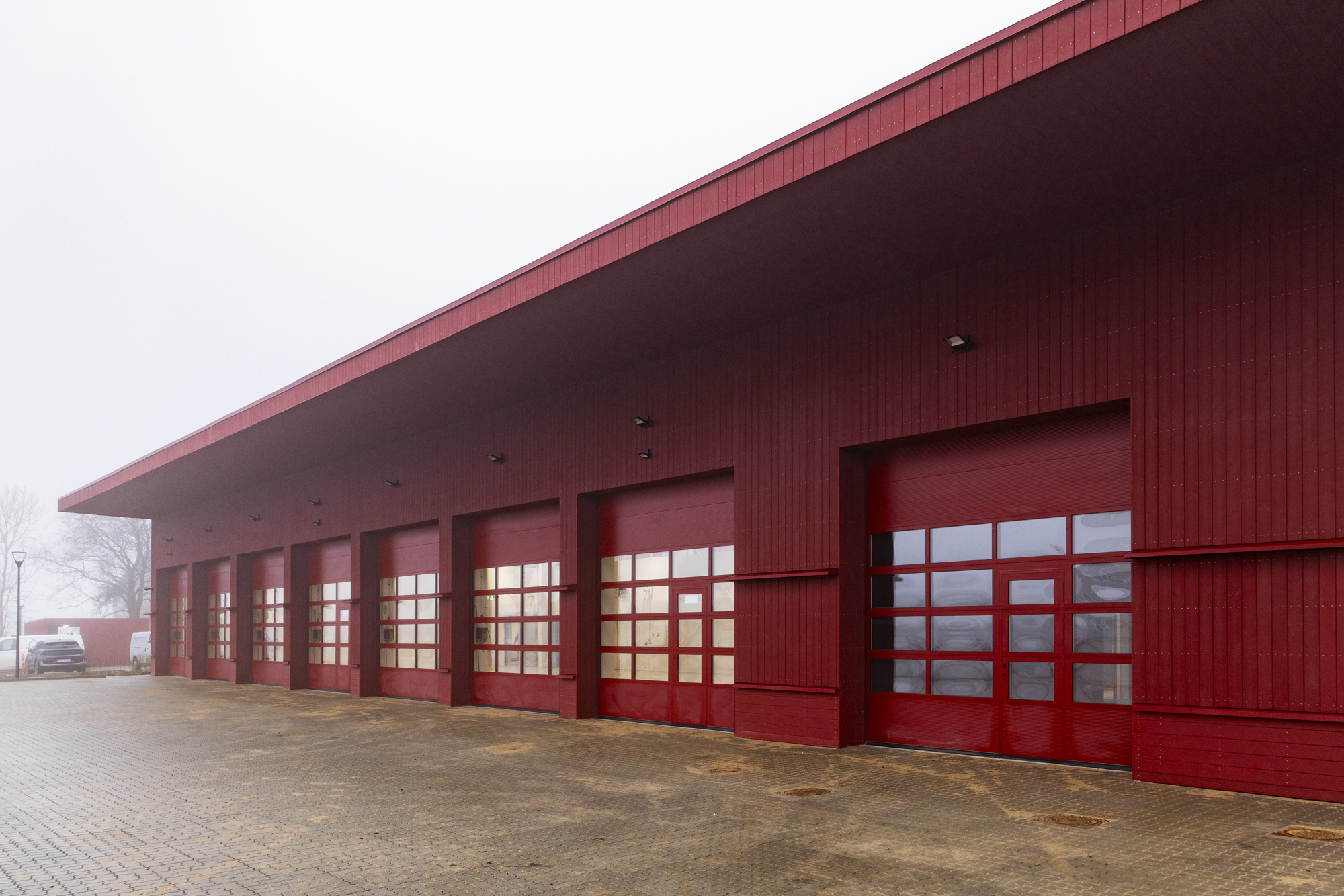 Garagens facade domineres af et markant udhæng og portene med kig til brandbilerne