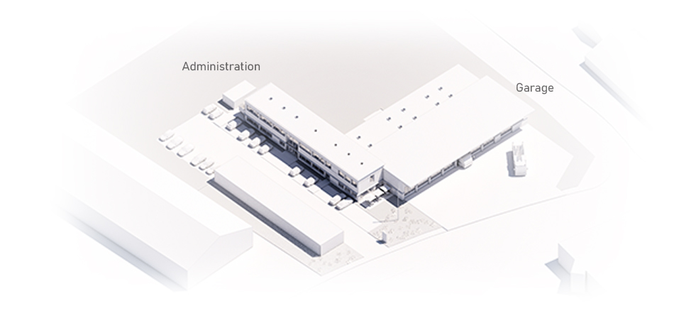 Garagebygningen ligger strategisk ud mod Kobbervej, så brandkøretøjerne kan rykke hurtigt ud og samtidig være synlige for forbipasserende gennem de store porte. Administrationsbygningen er placeret langs ankomstområdet og de grønne omgivelser, let tilbagetrukket for at fremhæve garagens centrale rolle i anlægget.