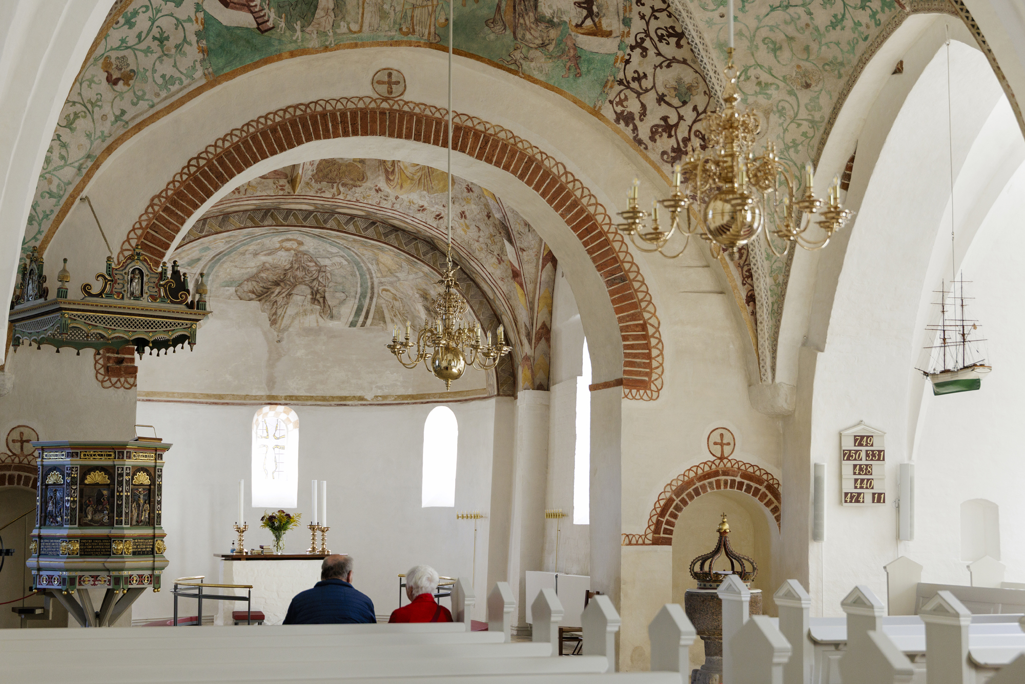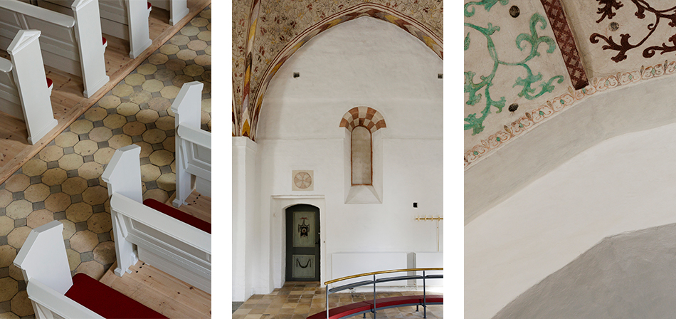 Kirkerummets overflader og historiske inventar er omhyggeligt istandsat. Det er en balance mellem det, der skal bevares, og det, der skal fornyes, og her går bevaringshensyn og kompetent håndværk hånd i hånd. Kalkmalerierne fra Det Nye Testamente står urørte, mens de øvrige kalkede overflader er støvsuget, renset og behandlet med hvidtekalk.