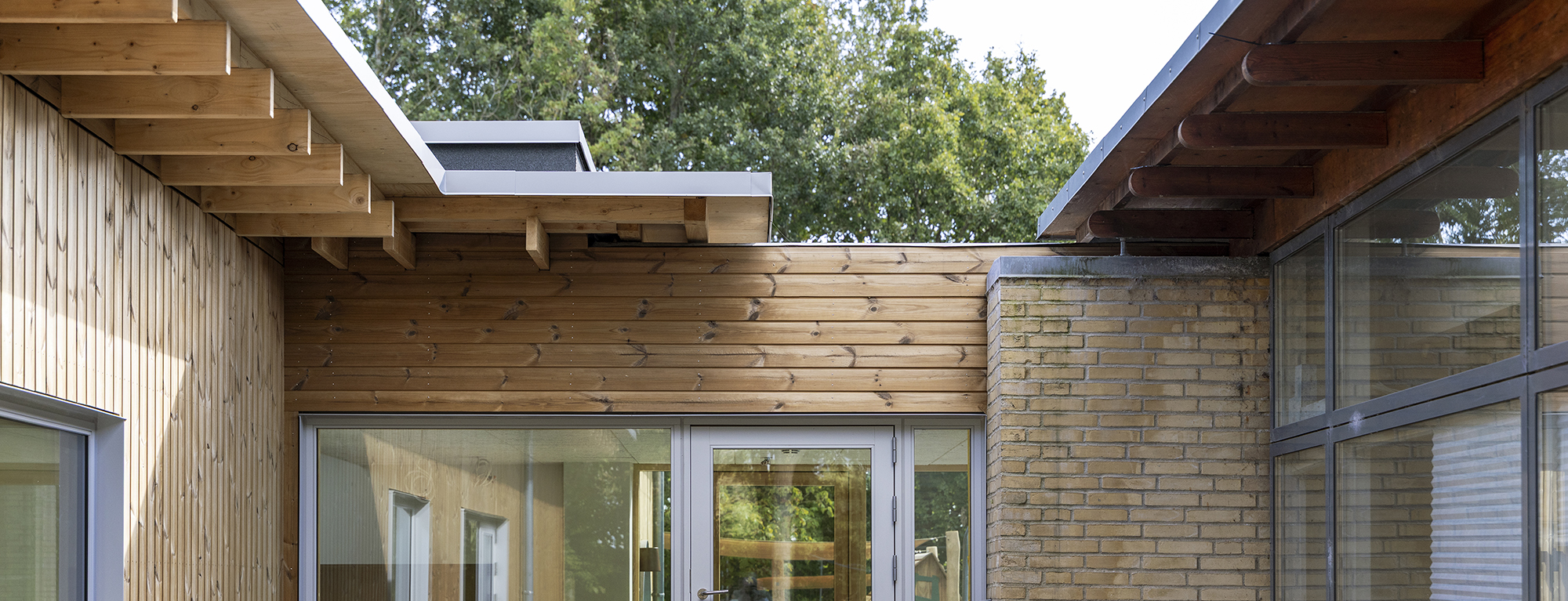 Udformning og relation til den eksisterende institutionDen lange, smalle grund mellem adgangsvejen og den eksisterende bygning har været formgivende for projektet. Tilbygningen viderefører institutionens princip med facadespring, der trinvis forskyder sig. Denne bearbejdning nedbryder den lange facade mod adgangsvejen, skaber variation og danner samtidig spændende rumforløb både mod ankomsten og mod vuggestuens udearealer. Selvom tilbygningen er opført i træ – i kontrast til den eksisterende teglbygning – skaber skalaen og facadernes rytme en tydelig dialog mellem de to bygninger.
