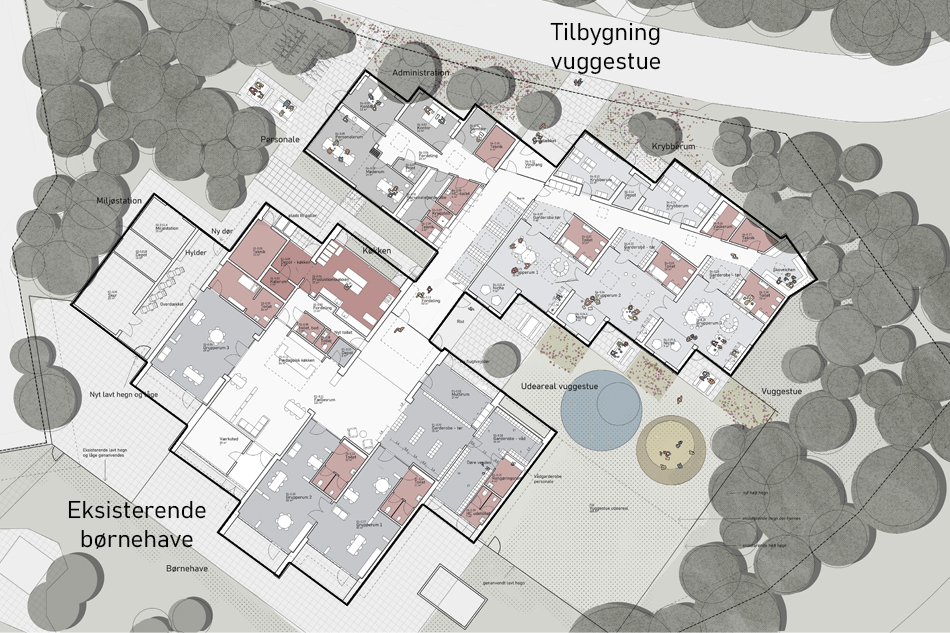 Rumlig bearbejdning af udearealerFacadespringene opdeler udearealet i mindre zoner, så hver gruppe får sit eget ”private” uderum. Store tagudhæng er inspireret af den eksisterende bygning, men er her forstærket, så de danner overdækkede opholdsarealer ved både hovedindgangen og grupperummene. Ved grupperummene fungerer udhængene som en forlængelse af børnenes leg og aktiviteter ud i udearealet.