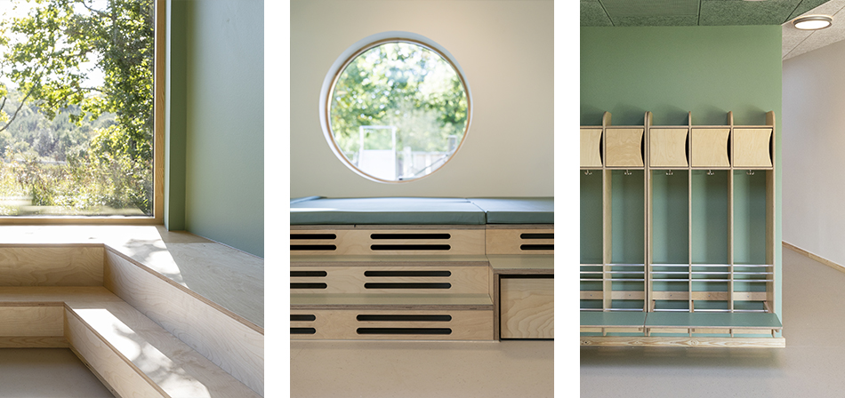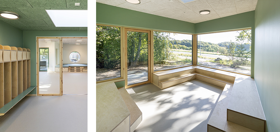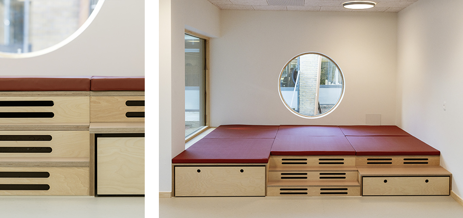 Interiør, farver og stemningIndvendigt er de tre nye grupperum rummelige og fleksible. Dobbeltdøre gør det muligt at forbinde rummene på tværs, så aktiviteter og grupper kan samles eller opdeles efter behov. Hvert grupperum rummer en hævet niche, der fungerer som ”rum i rummet” og skaber mindre, trygge zoner med kig til udearealerne – blandt andet gennem tre karakteristiske runde vinduer.